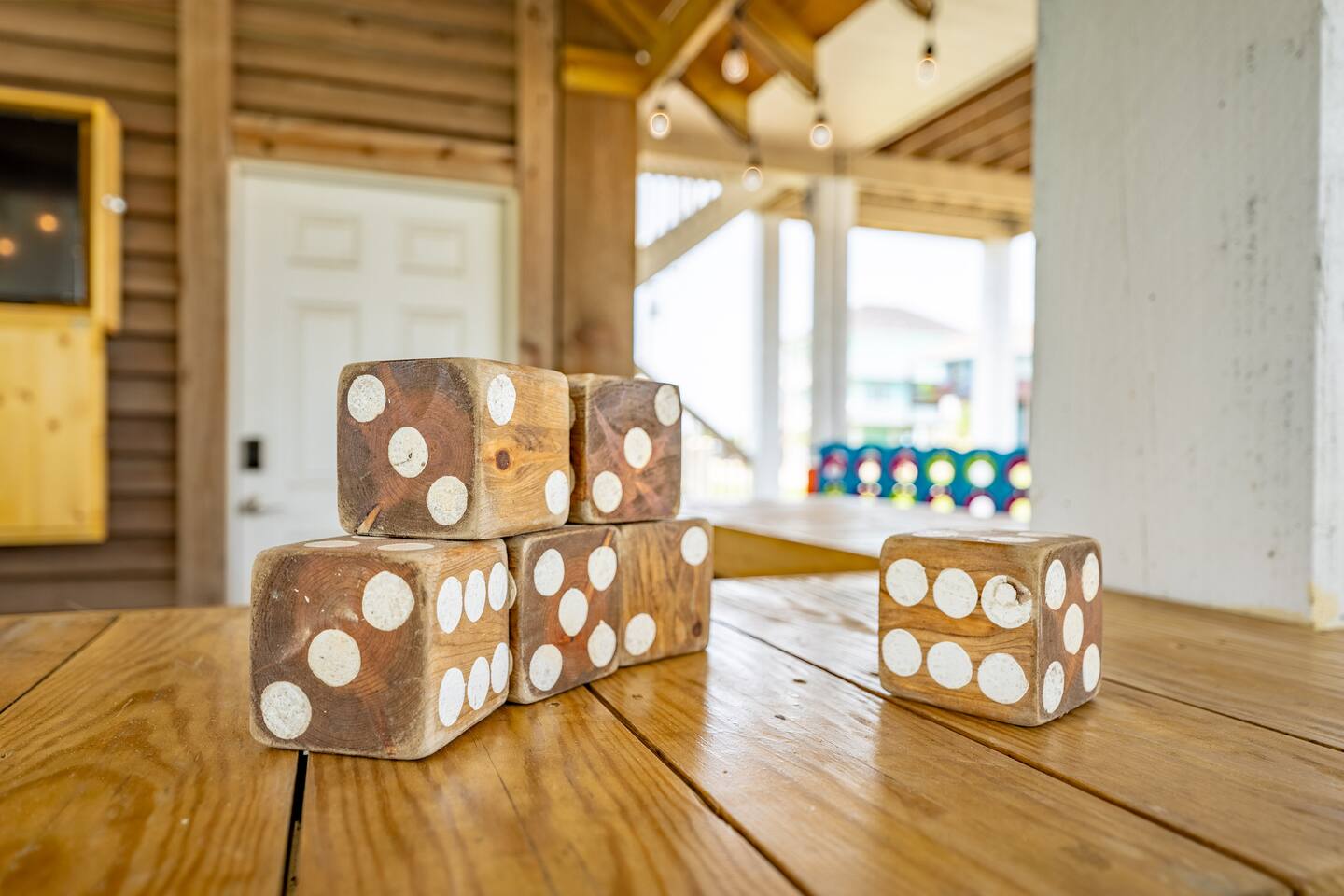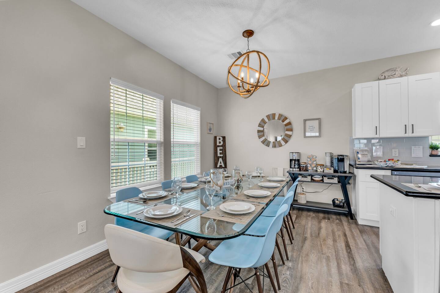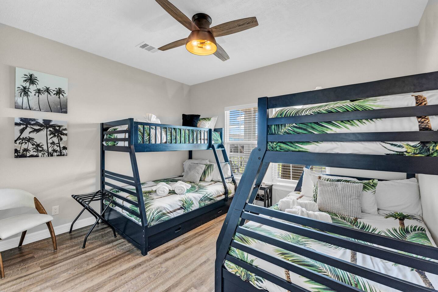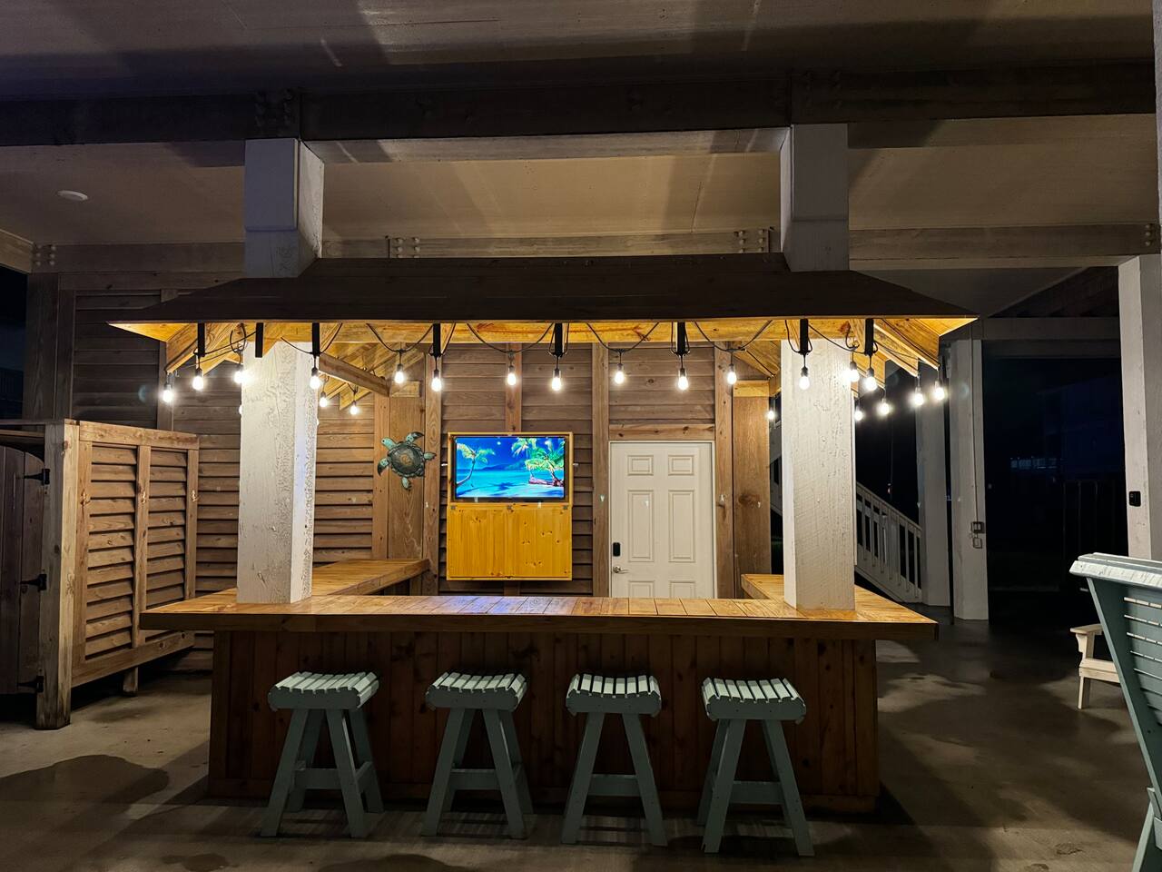 **FEATURES & AMENITIES** - Tropical covered Tiki bar with lights with TV - 7 person hot tub - Two hanging daybeds - Spacious outdoor area with plenty of seating options - Yard games, beach chairs, beach toys, and more - Outdoor shower to cool off after a day at the beach - Built-in stainless steel gas grill for outdoor cooking - Covered spacious porch for outdoor relaxation - Board games and playing cards for indoor entertainment - Fresh linens, towels, and beach towels for your comfort - Free parking for up to 6 vehicles - Central air conditioning and ceiling fans in every room - Free high-speed WiFi - Two 55” smart TVs with Roku streaming devices (living room and master suite) - Three 43" smart TV with Roku (second-level queen bedroom, two bunk rooms, & Tiki bar) - Two retro gaming sticks with over 20,000 games in two bunk bed rooms **LIVING ROOM** - Spacious, open-concept living room - 55" Smart TV with Roku streaming device & DVD player - Large sectional and 2 accent chair & bench for family and friends - Plenty of blankets and pillows for a family movie night **KITCHEN & DINING** - Fully stocked luxury kitchen with stainless steel appliances - Island and table seating for 12 people - Keurig and drip-coffee options for the perfect cup of coffee - Toaster, blender, crockpot, knife block, insta-pot/rice cooker and much more - Kitchen essentials: Spices, cooking spray, olive oil, tea bags, coffee grounds, k-cups, creamer, sugar, and coffee filters **SLEEPING ARRANGEMENTS** - Total of 10 beds for all your family's needs - One master suite with king-size bed - One queen bedroom - Two bedrooms each featuring 2 twin-over-full bunk beds, perfect for children and adults - Extra pillows and blankets **BATHROOMS** - Two (2) fully stocked bathrooms - Fresh towels - Makeup towels - Shampoo, conditioner, and body wash dispensers - Hairdryers **STARTER PACK** - 2 kitchen trashcan liners per day stay - 2 roll of paper towels - 2 dishwasher pods per day stay - 1 kitchen sponge - 15 coffee pods - 20 tea bags - ½ full cannister of regular coffee grounds ½ full cannister of decaf coffee grounds - 2 trashcan liners per bathroom - 4 rolls of toilet paper per bathroom - 2 outdoor black trash bag per outdoor can Whether you're looking to spend your days lounging on the beach, exploring nearby attractions, or simply enjoying the laid-back coastal living lifestyle, our beachside property has something for everyone. Book your stay today and create unforgettable memories on your next beach vacation!
