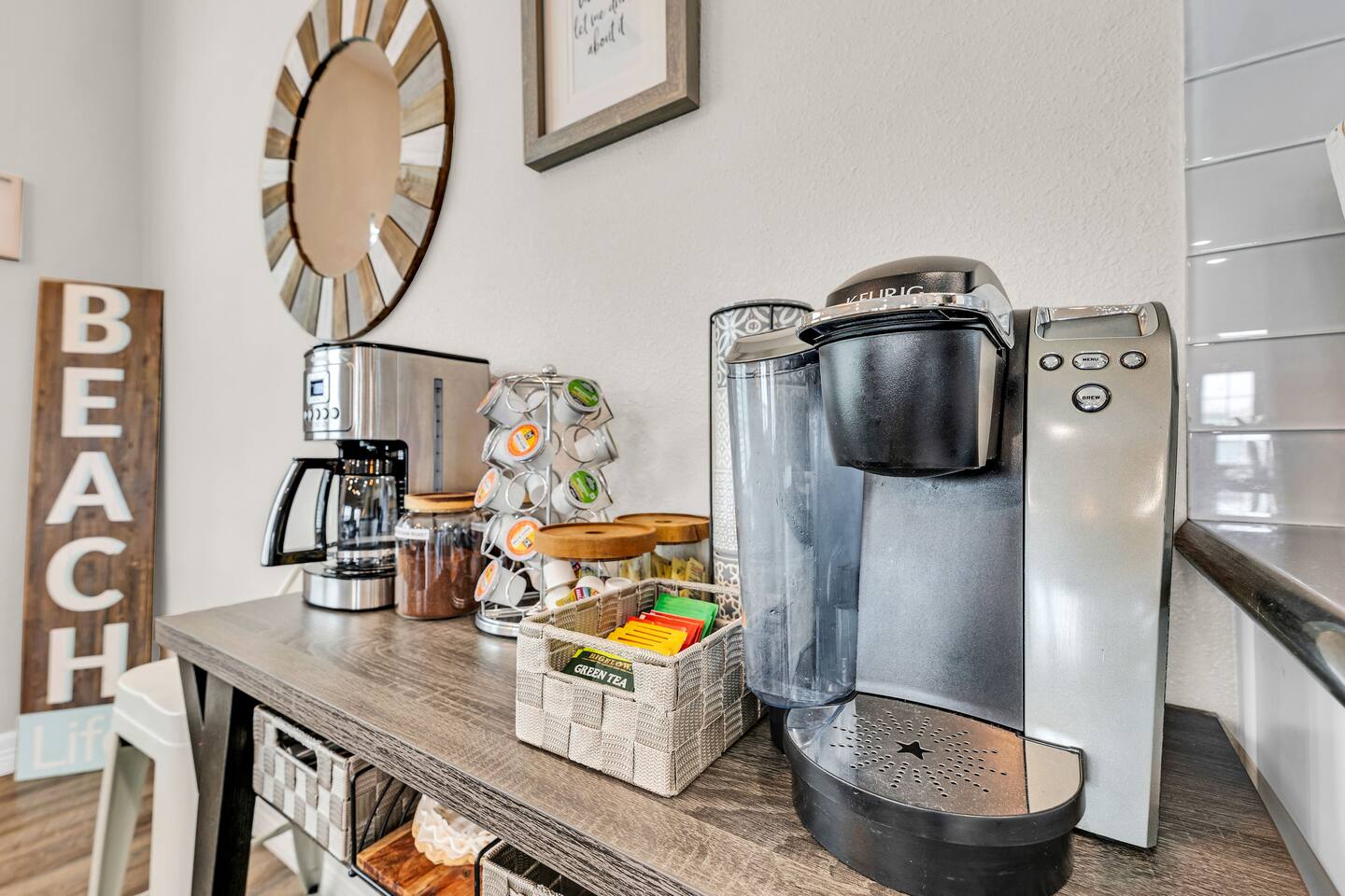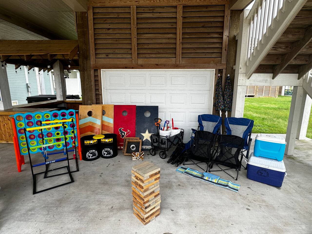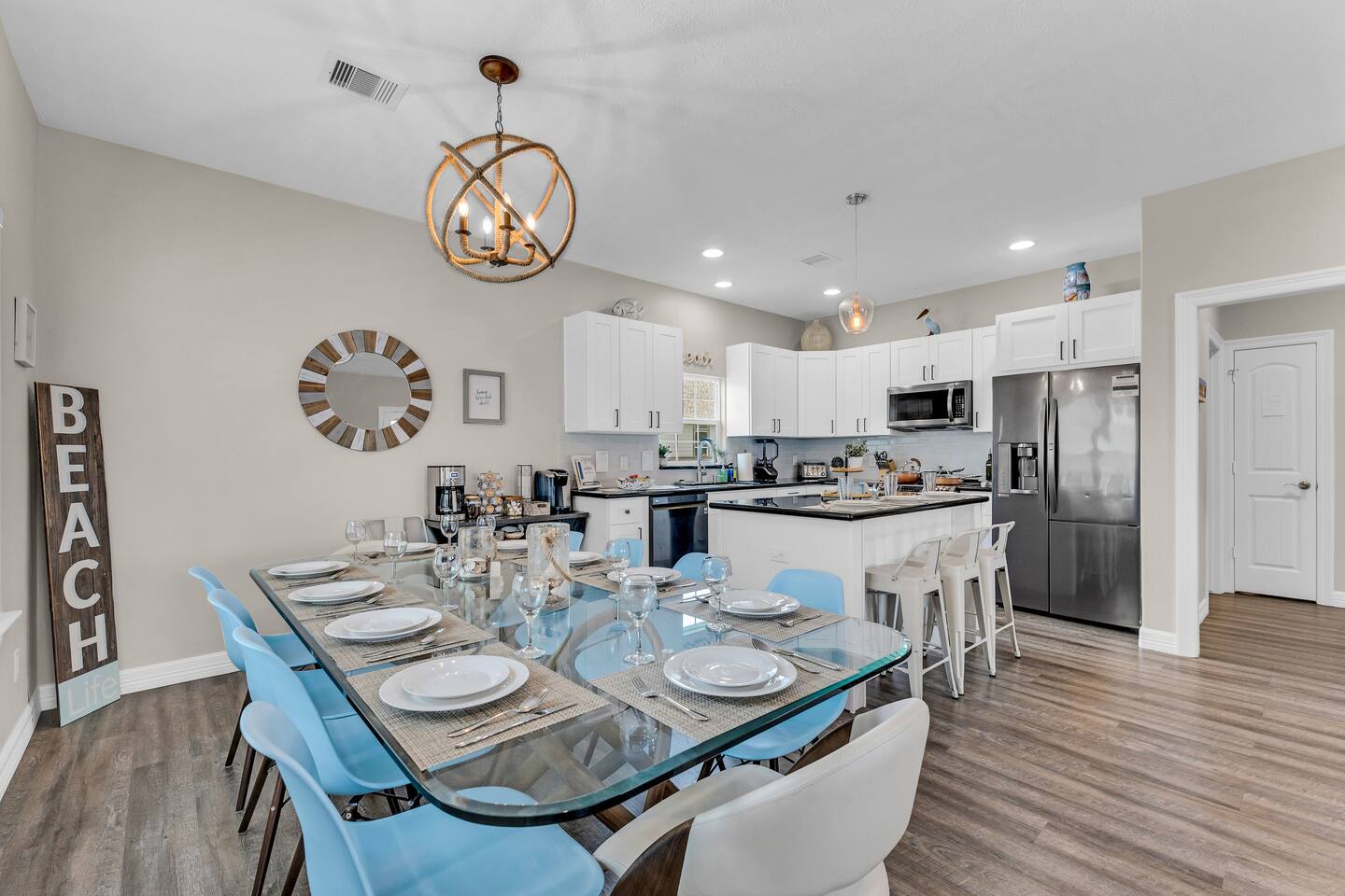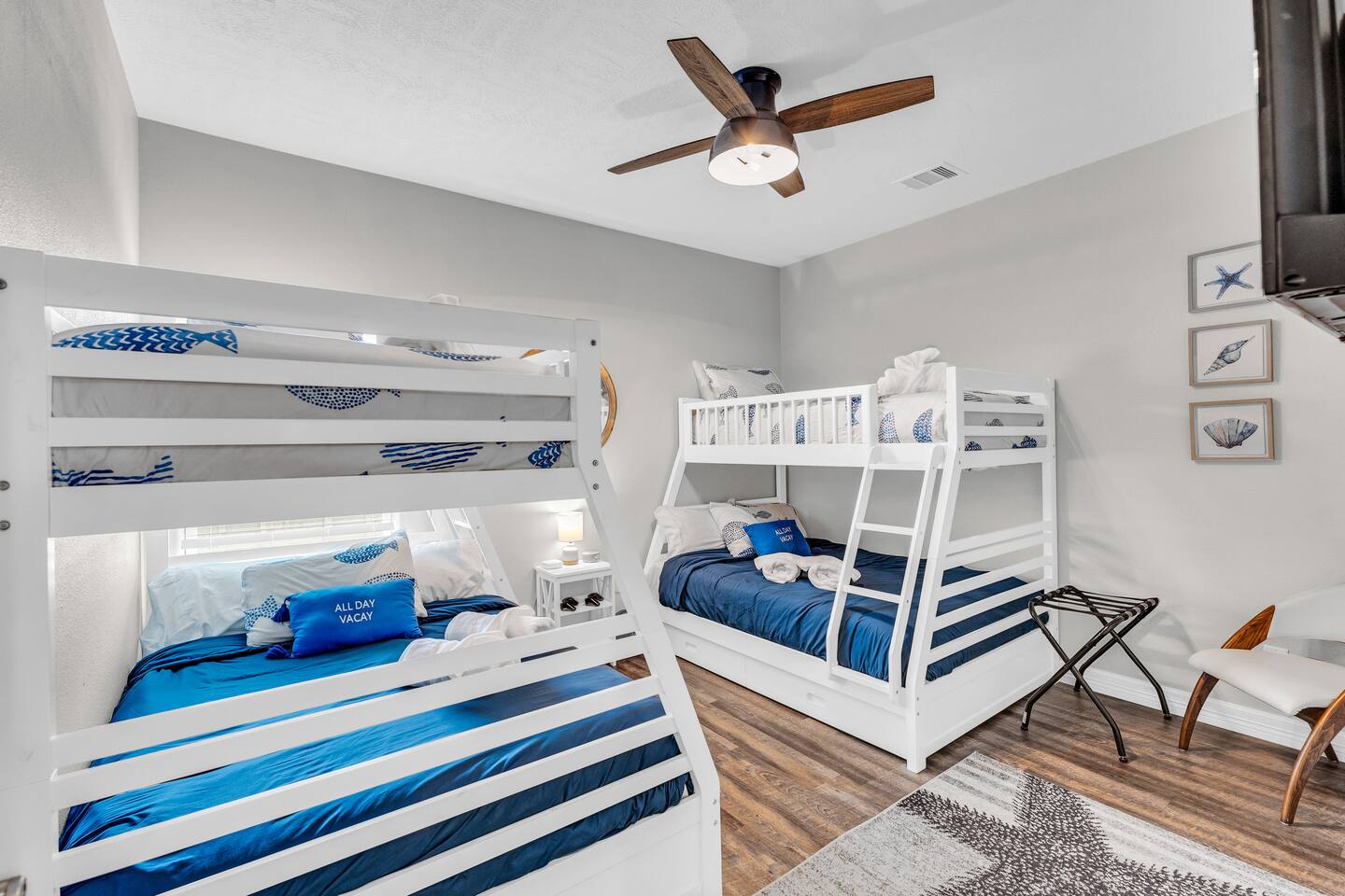 **FEATURES & AMENITIES** - Tropical covered Tiki bar with lights with TV - 7 person hot tub - Two hanging daybeds - Spacious outdoor area with plenty of seating options - Yard games, beach chairs, beach toys, and more - Outdoor shower to cool off after a day at the beach - Built-in stainless steel gas grill for outdoor cooking - Covered spacious porch for outdoor relaxation - Board games and playing cards for indoor entertainment - Fresh linens, towels, and beach towels for your comfort - Free parking for up to 6 vehicles - Central air conditioning and ceiling fans in every room - Free high-speed WiFi - Two 55” smart TVs with Roku streaming devices (living room and master suite) - Three 43" smart TV with Roku (second-level queen bedroom, two bunk rooms, & Tiki bar) - Two retro gaming sticks with over 20,000 games in two bunk bed rooms **LIVING ROOM** - Spacious, open-concept living room - 55" Smart TV with Roku streaming device & DVD player - Large sectional and 2 accent chair & bench for family and friends - Plenty of blankets and pillows for a family movie night **KITCHEN & DINING** - Fully stocked luxury kitchen with stainless steel appliances - Island and table seating for 12 people - Keurig and drip-coffee options for the perfect cup of coffee - Toaster, blender, crockpot, knife block, insta-pot/rice cooker and much more - Kitchen essentials: Spices, cooking spray, olive oil, tea bags, coffee grounds, k-cups, creamer, sugar, and coffee filters **SLEEPING ARRANGEMENTS** - Total of 10 beds for all your family's needs - One master suite with king-size bed - One queen bedroom - Two bedrooms each featuring 2 twin-over-full bunk beds, perfect for children and adults - Extra pillows and blankets **BATHROOMS** - Two (2) fully stocked bathrooms - Fresh towels - Makeup towels - Shampoo, conditioner, and body wash dispensers - Hairdryers **STARTER PACK** - 2 kitchen trashcan liners per day stay - 2 roll of paper towels - 2 dishwasher pods per day stay - 1 kitchen sponge - 15 coffee pods - 20 tea bags - ½ full cannister of regular coffee grounds ½ full cannister of decaf coffee grounds - 2 trashcan liners per bathroom - 4 rolls of toilet paper per bathroom - 2 outdoor black trash bag per outdoor can Whether you're looking to spend your days lounging on the beach, exploring nearby attractions, or simply enjoying the laid-back coastal living lifestyle, our beachside property has something for everyone. Book your stay today and create unforgettable memories on your next beach vacation!