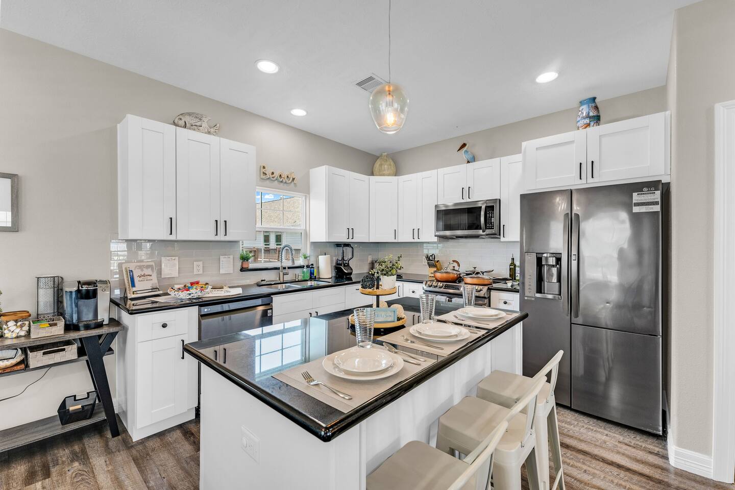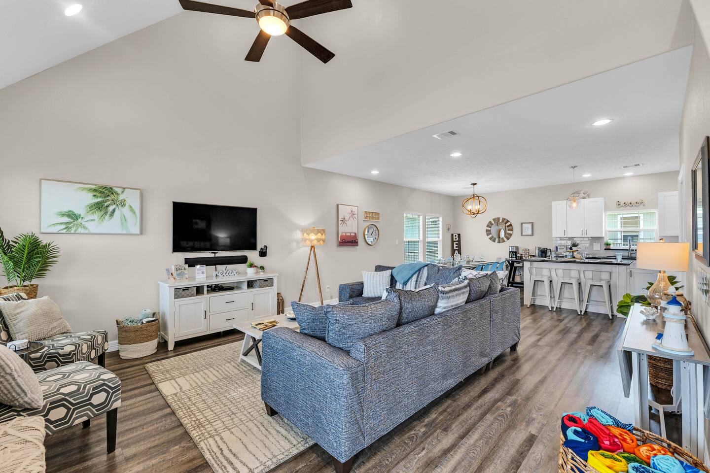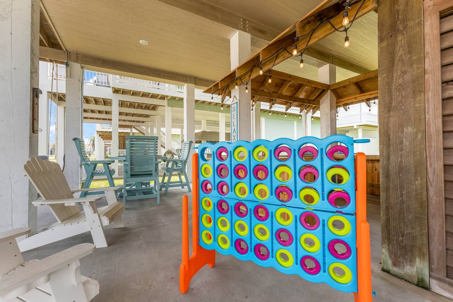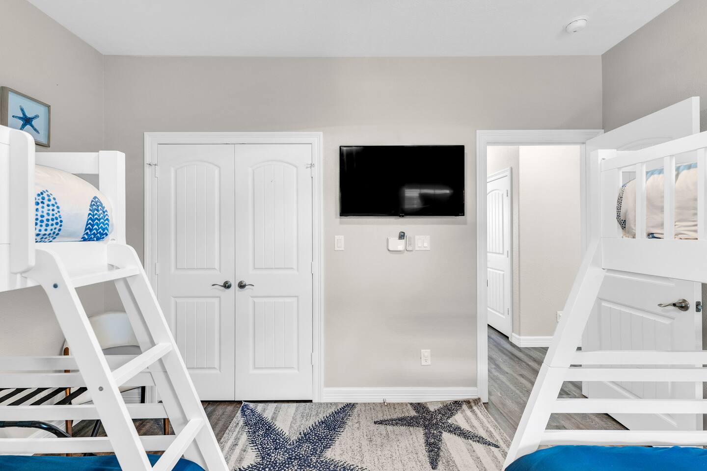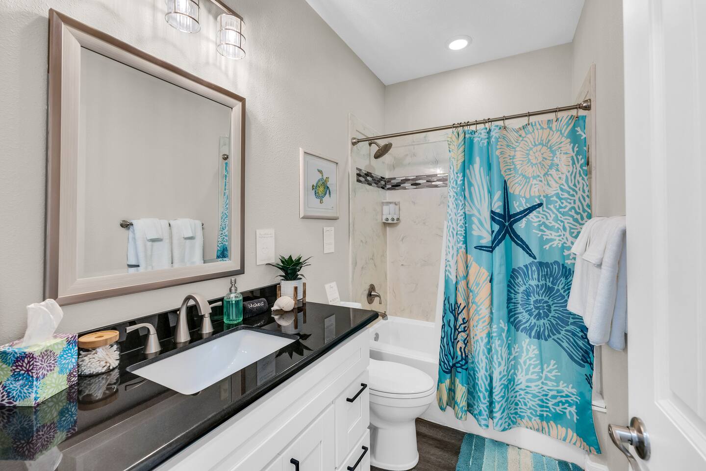 **FEATURES & AMENITIES** - Tropical covered Tiki bar with lights with TV - 7 person hot tub - Two hanging daybeds - Spacious outdoor area with plenty of seating options - Yard games, beach chairs, beach toys, and more - Outdoor shower to cool off after a day at the beach - Built-in stainless steel gas grill for outdoor cooking - Covered spacious porch for outdoor relaxation - Board games and playing cards for indoor entertainment - Fresh linens, towels, and beach towels for your comfort - Free parking for up to 6 vehicles - Central air conditioning and ceiling fans in every room - Free high-speed WiFi - Two 55” smart TVs with Roku streaming devices (living room and master suite) - Three 43" smart TV with Roku (second-level queen bedroom, two bunk rooms, & Tiki bar) - Two retro gaming sticks with over 20,000 games in two bunk bed rooms **LIVING ROOM** - Spacious, open-concept living room - 55" Smart TV with Roku streaming device & DVD player - Large sectional and 2 accent chair & bench for family and friends - Plenty of blankets and pillows for a family movie night **KITCHEN & DINING** - Fully stocked luxury kitchen with stainless steel appliances - Island and table seating for 12 people - Keurig and drip-coffee options for the perfect cup of coffee - Toaster, blender, crockpot, knife block, insta-pot/rice cooker and much more - Kitchen essentials: Spices, cooking spray, olive oil, tea bags, coffee grounds, k-cups, creamer, sugar, and coffee filters **SLEEPING ARRANGEMENTS** - Total of 10 beds for all your family's needs - One master suite with king-size bed - One queen bedroom - Two bedrooms each featuring 2 twin-over-full bunk beds, perfect for children and adults - Extra pillows and blankets **BATHROOMS** - Two (2) fully stocked bathrooms - Fresh towels - Makeup towels - Shampoo, conditioner, and body wash dispensers - Hairdryers **STARTER PACK** - 2 kitchen trashcan liners per day stay - 2 roll of paper towels - 2 dishwasher pods per day stay - 1 kitchen sponge - 15 coffee pods - 20 tea bags - ½ full cannister of regular coffee grounds ½ full cannister of decaf coffee grounds - 2 trashcan liners per bathroom - 4 rolls of toilet paper per bathroom - 2 outdoor black trash bag per outdoor can Whether you're looking to spend your days lounging on the beach, exploring nearby attractions, or simply enjoying the laid-back coastal living lifestyle, our beachside property has something for everyone. Book your stay today and create unforgettable memories on your next beach vacation!