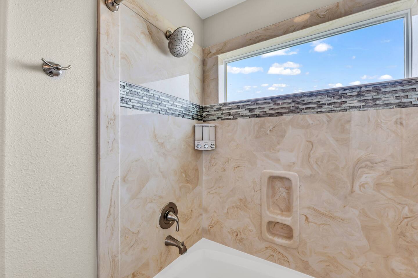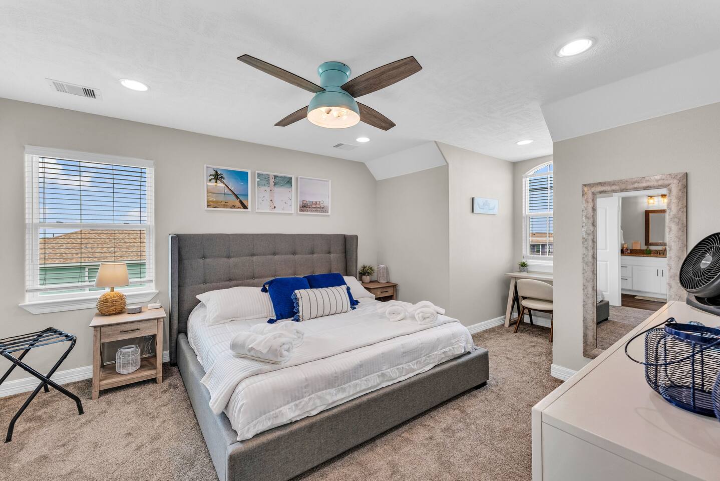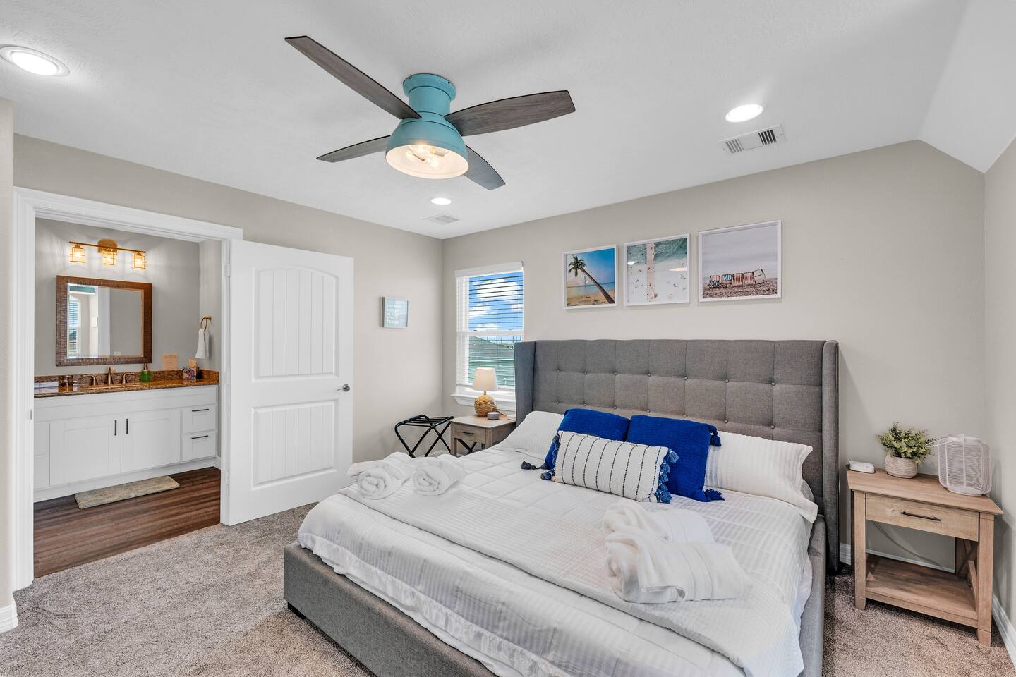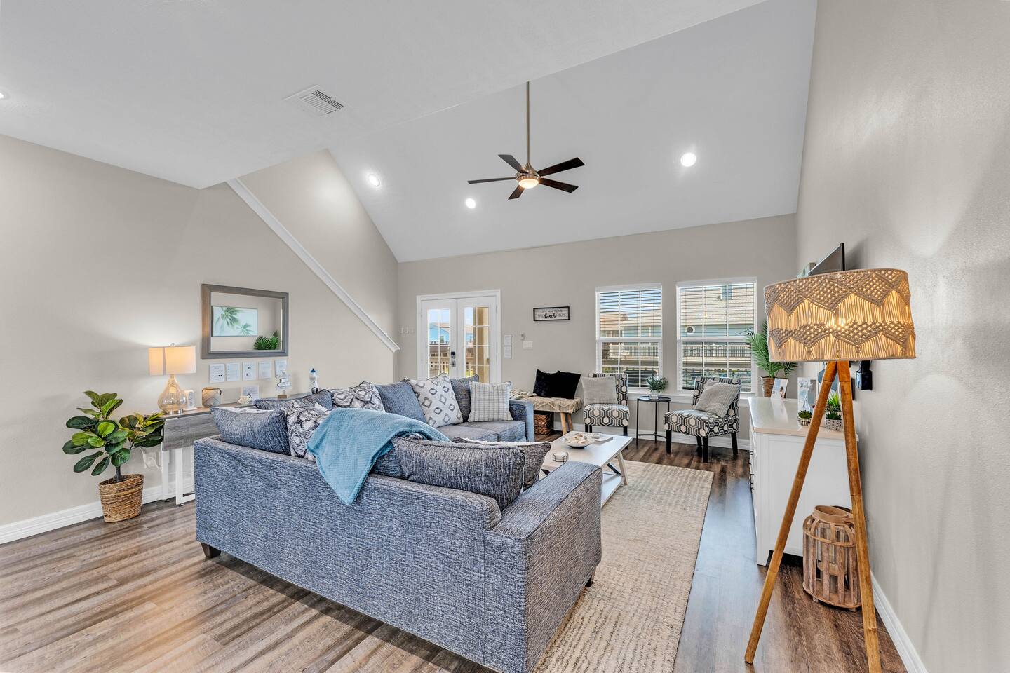 **FEATURES & AMENITIES** - Tropical covered Tiki bar with lights with TV - 7 person hot tub - Two hanging daybeds - Spacious outdoor area with plenty of seating options - Yard games, beach chairs, beach toys, and more - Outdoor shower to cool off after a day at the beach - Built-in stainless steel gas grill for outdoor cooking - Covered spacious porch for outdoor relaxation - Board games and playing cards for indoor entertainment - Fresh linens, towels, and beach towels for your comfort - Free parking for up to 6 vehicles - Central air conditioning and ceiling fans in every room - Free high-speed WiFi - Two 55” smart TVs with Roku streaming devices (living room and master suite) - Three 43" smart TV with Roku (second-level queen bedroom, two bunk rooms, & Tiki bar) - Two retro gaming sticks with over 20,000 games in two bunk bed rooms **LIVING ROOM** - Spacious, open-concept living room - 55" Smart TV with Roku streaming device & DVD player - Large sectional and 2 accent chair & bench for family and friends - Plenty of blankets and pillows for a family movie night **KITCHEN & DINING** - Fully stocked luxury kitchen with stainless steel appliances - Island and table seating for 12 people - Keurig and drip-coffee options for the perfect cup of coffee - Toaster, blender, crockpot, knife block, insta-pot/rice cooker and much more - Kitchen essentials: Spices, cooking spray, olive oil, tea bags, coffee grounds, k-cups, creamer, sugar, and coffee filters **SLEEPING ARRANGEMENTS** - Total of 10 beds for all your family's needs - One master suite with king-size bed - One queen bedroom - Two bedrooms each featuring 2 twin-over-full bunk beds, perfect for children and adults - Extra pillows and blankets **BATHROOMS** - Two (2) fully stocked bathrooms - Fresh towels - Makeup towels - Shampoo, conditioner, and body wash dispensers - Hairdryers **STARTER PACK** - 2 kitchen trashcan liners per day stay - 2 roll of paper towels - 2 dishwasher pods per day stay - 1 kitchen sponge - 15 coffee pods - 20 tea bags - ½ full cannister of regular coffee grounds ½ full cannister of decaf coffee grounds - 2 trashcan liners per bathroom - 4 rolls of toilet paper per bathroom - 2 outdoor black trash bag per outdoor can Whether you're looking to spend your days lounging on the beach, exploring nearby attractions, or simply enjoying the laid-back coastal living lifestyle, our beachside property has something for everyone. Book your stay today and create unforgettable memories on your next beach vacation!